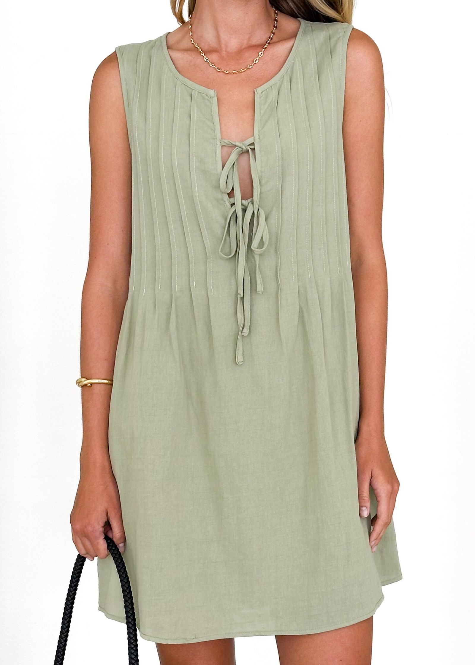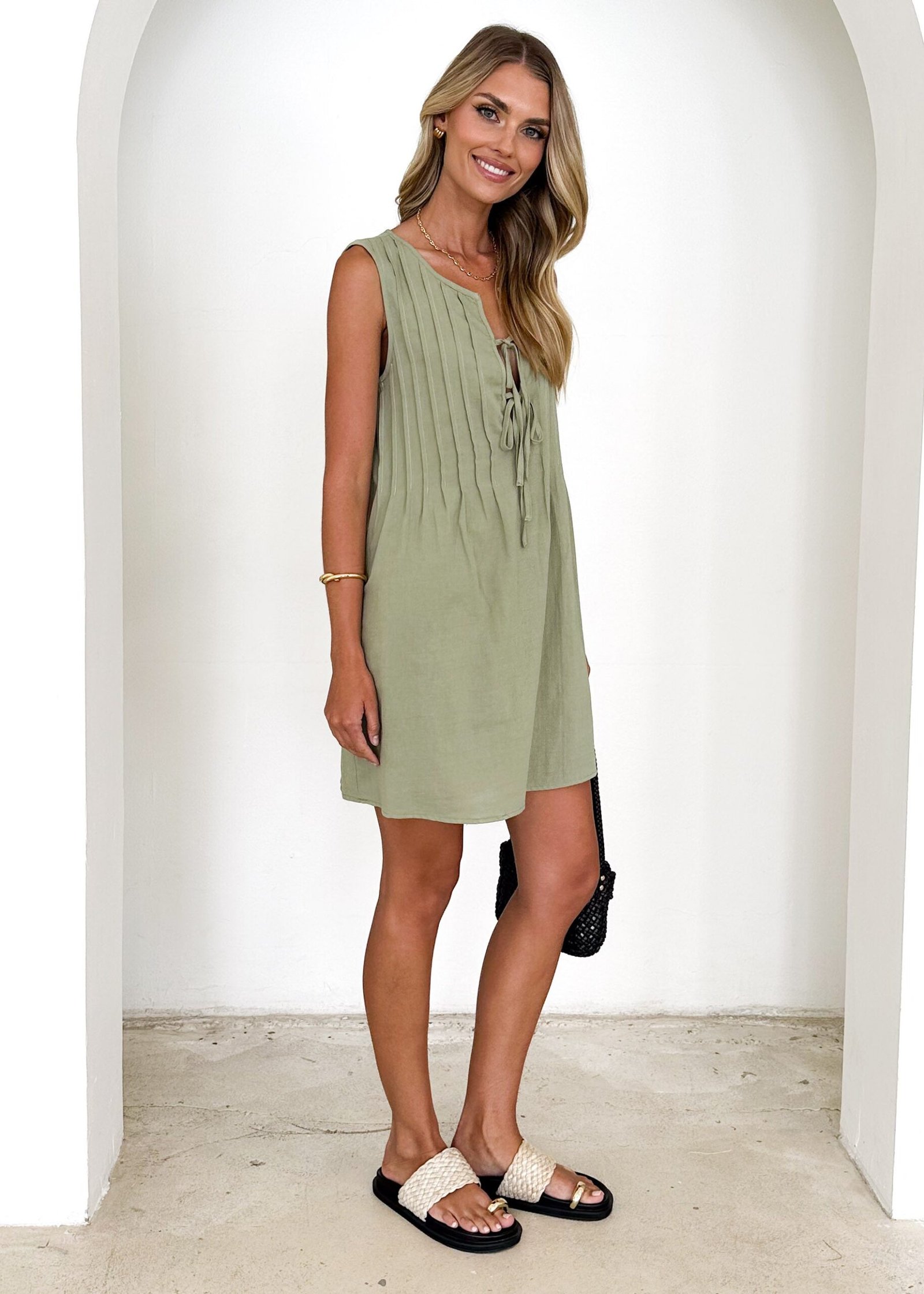 The Khaki Ismene Dress combines effortless style with modern charm. Pair it with nude strappy sandals and a structured tote for an on-trend daytime look. Style your hair in a sleek low bun. accented with a tortoiseshell hairpin. and add a chunky gold bracelet to complete the ensemble.Make a statement—shop the Ismene Dress now!